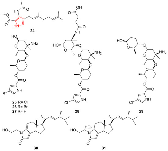 The pyrrole alkaloids geranylpyrrol A (24), phallusialides A–E (25–29), and anandins A and B (30–31). The structural alkaloid group is represented in red.