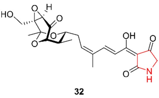 Pyrrolidines are structurally similar to pyrroles, yet only one pyrrolidine was discovered in marine actinomycetes. Since 2017, this class of alkaloids was most prevalently discovered in marine fungi [11]. Cong et al. (2018) isolated isotirandamycin B (32) from Streptomyces sp. SCSIO 41399, a strain retrieved in 2016 from coral Porites sp. located in Wenchang, China [31]. The compound (Figure 5) was screened for antibacterial activity and was found to be active against Streptococcus agalactiae. In addition, antifungal activities against Colletotrichum gloeosporioides, Colletotrichum asianum, Colletotrichum acutatum, Fusarium oxysporum, and Pleomorphomonas oryza was evaluated, but no activity was detected. Moreover, 32 exhibited no cytotoxic effects on K562 and BEL-7402 cells.