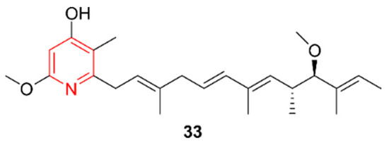 The pyridine alkaloid piericidin F (33). The structural alkaloid group is represented in red.