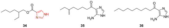 Since 2017, three new imidazoles have been discovered in marine actinomycetes. Chen et al. (2019) identified 2-ethylhexyl 1H-imidazole-4-carboxylate (34) from Verrucosispora sp. FIM06-0036, a strain isolated from a marine sponge in the East China Sea [33]. Antimicrobial activities were observed against Helicobacter pylori, Klebsiella pneumonia, S. aureus, and Enterococcus faecium, with MICs of 8 µg/mL 64 µg/mL, 16 µg/mL, and 256 µg/mL, respectively.