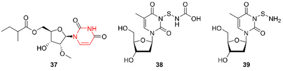 In 2019, Shaala et al. discovered two additional nucleoside analogues, namely thymidine-3-mercaptocarbamic acid (38) and thymidine-3-thioamine (39), from Streptomyces species Call-36 (Figure 8) [37]. This actinomycete strain was isolated from the Red Sea sponge Callyspongia. Both compounds were evaluated for their cytotoxic activities against HCT-116 (colorectal carcinoma) and MCF-7 (breast cancer) and exhibited only weak activity against human breast cells. The antimicrobial properties of these compounds were not evaluated.
