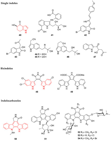 Indoles are among the best-studied alkaloids in the marine environment, which is reflected by the number of discovered compounds of this class. While this review focuses on alkaloids with an Actinobacteria origin, alkaloids produced by marine fungi after 2015 have been covered by Willems et al. (2020) [11]. An exhaustive review on marine indoles unraveled prior to 2015 is also available [38]. In this paper, indoles are subdivided into three subgroups: single indoles, bisindoles, and indolocarbazoles (Figure 9).