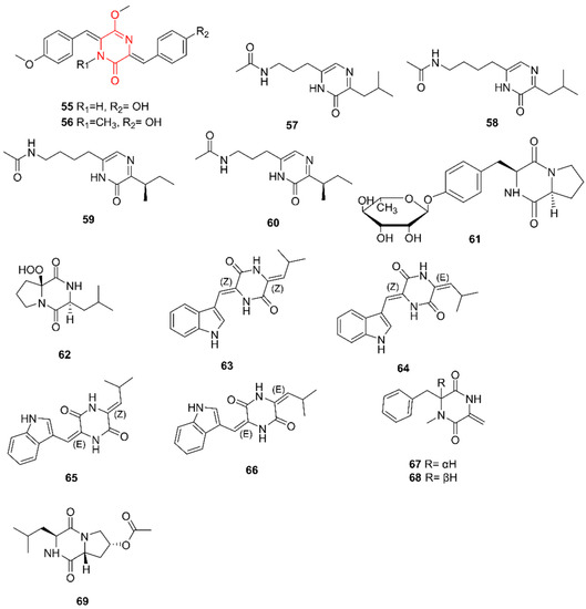 The diketopiperazine alkaloids nocazines F and G (55–56), streptopyrazinones A–D (57–60), maculosin-O-α-L-rhamnopyranoside (61), actinozine A (62), photopiperazines A–D (63–66), streptodiketopiperazines A and B (67–68), and cyclo-(D-8-acetoxyl-Pro-L-Leu) (69). The structural alkaloid group is represented in red.
