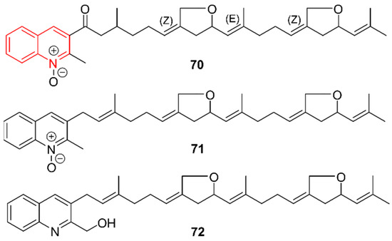 The quinoline alkaloids marinoterpins A–C (70–72). The structural alkaloid group is represented in red.
