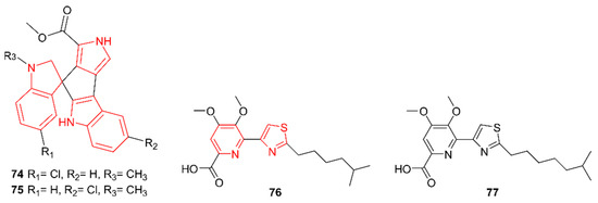 In recent years, several alkaloid hybrids composed of more than one alkaloid core structure have been unraveled (Figure 13). Paulus et al. (2017) discovered spiroindimicins E and F (74–75) from Streptomyces sp. MP131-18, a strain isolated from a marine sediment sample collected in the Trondheim Fjord, Norway [62]. These compounds have both a pyrrole and a bisindole core. They were discovered through genomics-metabolomics profiling, whereby the biosynthetic gene cluster information was mapped to the secondary metabolites profile of the strain. The biosynthesis involved a tryptophan 2-monooxygenase, a chromopyrrolic acid synthase, and a cytochrome P450, three core enzymes necessary for the formation of bisindole pyrroles. Only 74 was tested for antimicrobial activity against B. subtilis, E. coli, and Pseudomonas putida, yet no activity was detected. Within the group of spiroindimicins, the degree of halogenation seemed to influence antimicrobial activity. For example, spiroindimicin B contains two halogens and possesses weak antimicrobial activity. In contrast, compound 74 has only one chlorine moiety, possibly explaining its lack of antimicrobial activity. In addition, 74 showed minor cytotoxic effects on T24 bladder carcinoma cells.