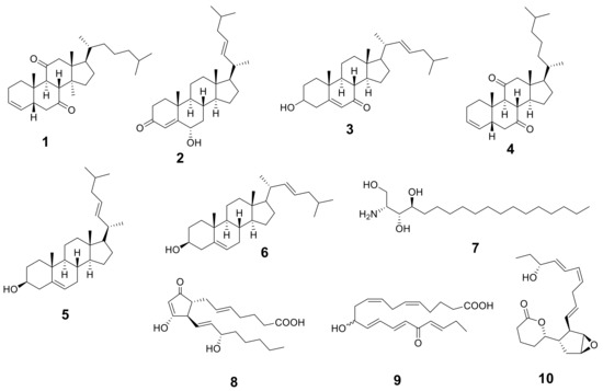 - Yaoita, Y.; Kohata, R.; Kakuda, R.; Machida, K.; Kikuchi, M. Ceramide Constituents from Five Mushrooms. Chem. Pharm. Bull. 2002, 50, 681–684. [Google Scholar] [CrossRef]