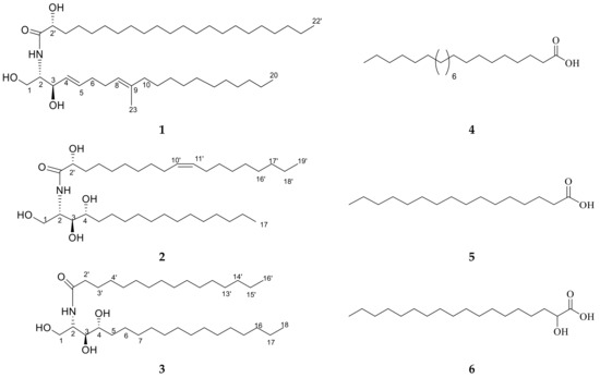 The red algae Hypnea musciformis (430 g fresh weight) was freeze-dried, ground, and soaked in methanol (3 × 2 L) at room temperature. Then, the combined methanol extracts were evaporated under a vacuum, resulting in 32 g of green residue. The total methanol extract was then fractionated by partitioning with different solvents in increasing order of polarity several times to afford an n-hexane fraction (3.67 g), a chloroform fraction (2.33 g), an ethyl acetate fraction (7.43 g), an n-butanol fraction (3.07 g), and finally an aqueous fraction. The ethyl acetate fraction (Hp-EA, 7.43 g) was chromatographed with SiO2 column chromatography using hexane:EtOAc:methanol (80:20:0 up to 0:75:25) gradient elution, giving seven subfractions, Hp-EA-(1-7). Subfraction Hp-EA-4 (437 mg) was rechromatographed on silica gel using hexane:EtOAc:methanol (50:50:0 up to 0:90:10) gradient elution, giving five subfractions, Hp-EA-4-(1′-5′). One of the resultant subfractions, Hp-EA-4-2′, was applied to a sephadex LH-20 column eluted with CHCl3-MeOH (1:1), giving 3 subfractions, Hp-EA-4-2′-(1-3). Among them, ceramide A (1) (13 mg, white powder) was afforded from subfraction Hp-EA-4-2′-2. Ceramide A (1) was finally purified on an open ODS column using MeOH/H2O (8:2). Another subfraction, Hp-EA-4-2′-3, was subjected to silica gel column chromatography using EtOAc:methanol (95:5) to afford ceramide B (2) (15 mg, white powder) and ceramide C (3) (6 mg, white powder). Regarding the chloroform fraction (Hp-C, 2.33 g), it was chromatographed with SiO2 column chromatography using hexane:EtOAc (100:0 up to 25:75) gradient elution, giving 3 subfractions, Hp-C-(1-3). Subfraction Hp-C-1 (223 mg) was rechromatographed on silica gel using hexane:EtOAc (90:10 up to 70:30) gradient elution, giving two subfractions, Hp-C-1-(1′-2′). The first one, Hp-C-1-1′, afforded compound 4, white powder 10 mg in weight, while the second subfraction (Hp-C-1-2′) was applied to a sephadex LH-20 column eluted with CHCl3-MeOH (1:1), giving compound 5 (12 mg, white powder) and compound 6 (13 mg, white powder).