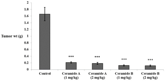 In accordance with the findings of the in vitro study, all groups treated with either ceramide A (1) or ceramide B (2) showed a significant decrease in tumor weight compared with the Ehrlich ascites carcinoma (EAC) control group (p < 0.001) (Figure 3).