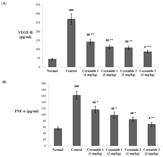 Effect of treatment with ceramide A and ceramide B at two dose levels (1 mg/kg and 2 mg/kg I.P) on the serum levels of (A) vascular endothelial growth factor B (VEGF-B) and (B) tumor necrosis factor-α (TNF-α). Values are expressed as mean ± SD. All data were analyzed using ANOVA followed by a Bonferroni post hoc test. # Significantly different compared with the normal group at p < 0.05. ## Significantly different compared with the normal group at p < 0.01. ### Significantly different compared with the normal group at p < 0.001. * Significantly different compared with the EAC control group at p < 0.05. ** Significantly different compared with the EAC control group at p < 0.01. *** Significantly different compared with the EAC control group at p < 0.001.