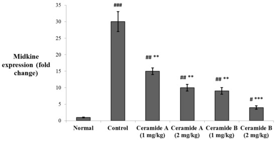 The levels of expression of midkine (MDK) in the tumor tissue were determined by real-time PCR. MDK was significantly upregulated in the EAC control group compared with the normal level (p < 0.001). The expression levels were significantly decreased in the groups treated with both doses of ceramide A (1) (1 and 2 mg/kg) and the lower dose of ceramide B (2) (1 mg/kg) (p < 0.01). The group treated with the higher dose of ceramide B (2) (2 mg/kg) showed the most significant downregulation of MDK compared with the EAC control group (p < 0.001) (Figure 5).