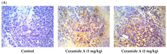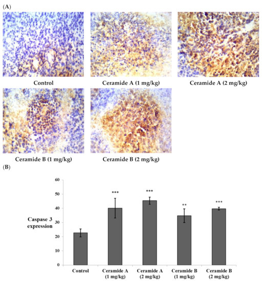 Effect of treatment with ceramide A and ceramide B at two dose levels (1 mg/kg and 2 mg/kg I.P) on the expression of caspase 3. (A) Representative photomicrographs of caspase 3, assessed immunohistochemically on day 21 in EAC-bearing female mice (40× magnification). (B) Optical density of positive immunohistochemical reactions (brown) determined using ImageJ. Values are expressed as mean ± SD. All data were analyzed using ANOVA followed by a Bonferroni post hoc test. ** Significantly different compared with the EAC control group at p < 0.01. *** Significantly different compared with the EAC control group at p < 0.001.