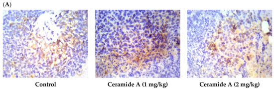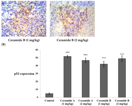 Effect of treatment with ceramide A and ceramide B at two dose levels (1 mg/kg and 2 mg/kg I.P) on the expression of p53. (A) Representative photomicrographs of p53 assessed immunohistochemically on day 21 in EAC-bearing female mice (40× magnification). (B) Optical density of positive immunohistochemical reactions (brown), determined using ImageJ. Values are expressed as mean ± SD. All data were analyzed using ANOVA followed by a Bonferroni post hoc test. *** Significantly different compared with the EAC control group at p < 0.001.