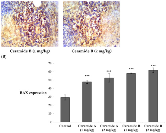 Effect of treatment with ceramide A and ceramide B at two dose levels (1 mg/kg and 2 mg/kg I.P) on the expression of p53. (A) Representative photomicrographs of Bax, assessed immunohistochemically on day 21 in EAC-bearing female mice (40× magnification). (B) Optical density of positive immunohistochemical reactions (brown) determined using ImageJ. Values are expressed as mean ± SD. All data were analyzed using ANOVA followed by a Bonferroni post hoc test. *** Significantly different compared with the EAC control group at p < 0.001.