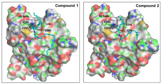 Ceramides have been considered a group of endogenous sphingolipids with the ability to interfere with the signaling pathways both upstream and downstream of p53 [85]. Under normal non-stressed conditions, the p53 transcription factor undergoes ubiquitination by the E3-ligase mouse double minute 2 (MDM2). This process prepares p53 for the proteasomal degradation. Disruption of the complex between p53 and MDM2 leads to p53 accumulation, nuclear translocation, and activation of the downstream apoptotic pathways [86]. The role of ceramides in the regulation of p53 has remained controversial for a long time, with studies suggesting direct and indirect cross-talk. Recently, in 2018, Fekry et al. from the University of North Carolina showed that C16-ceramides could directly interact with p53 [87]. They provided experimental evidence that ceramides bind in close proximity to the BOX V motif of p53, which is a part of the p53–MDM2 interface. Consequently, this binding disrupts the p53-MDM2 binding, reducing the ubiquitination and proteasomal degradation of p53. To gain insights into the molecular determinants of the binding of our ceramides A (1) and B (2) into the putative binding site of p53, we decided to perform a molecular docking simulation into the crystal structure of the human p53 (2MEJ). Both molecules showed very similar docked poses to the one proposed by Fekry et al. (Figure 9). In both cases, the central polar part of the compounds was oriented close to the polar residues Arg280 and Asp281 at the base of the H2 helix, probably stabilized by forming water-mediated H bonds. The two long hydrophobic tails of both compounds fit in a complementary fashion into the deep groove between the H2 helix and the Ser240-P250 loop. To our delight, the C10 atom of the acyl chain of both ceramides was docked in close proximity to Ser240 and Ser241. These residues have been proven by the aforementioned research group, using MS-proteomics experiments, to participate in C16-ceramide binding to p53 [87]. Moreover, they used modified C16-ceramide with a diaziridine group to show that the ceramide C10 atom binds proximal to Ser240 and Ser241. Interestingly, a very similar orientation of C10 was noticed in the top-ranked docking poses of both ceramides A (1) and B (2).