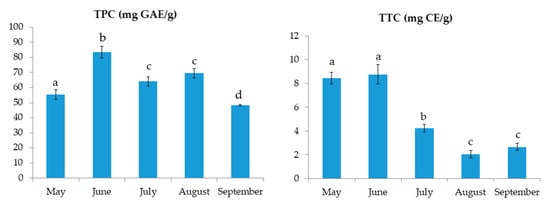 Total phenolic content (TPC) and total tannin content (TTC) of C. compressa extracts from May to September. a–d different letters denote statistically significant difference (n = 4).