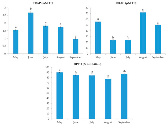 FRAP, ORAC and DPPH inhibition results for C. compressa extracts from May to September. a–d different letters denote statistically significant difference (n = 4).