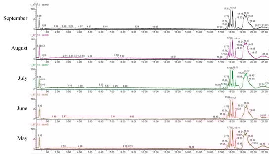 The most dominant compound tentatively identified was oleic acid (C18:1n-9) with a content more than 15% in all tested samples, highest in May. The other two dominant compounds were palmitoleic acid (C16:1n-7) and palmitic acid (C16:0) also showing highest content in the May extract. Except for highly represented fatty acids, ω-3 eicosapentaenoic acid (EPA) was also found, with the highest content in July.