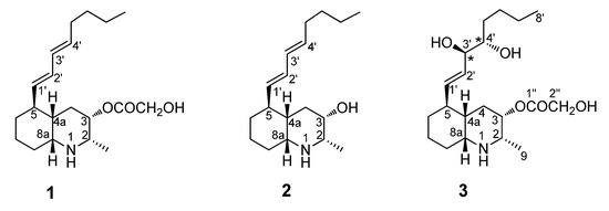 - Lepadin L acetonide (4): colorless oil; 1H NMR spectrum (CD3OD) is reported in Supplementary Material (Figure S13); HRMS (ESI): m/z 410.2899 [M + H]+ (calcd. for C23H40O5N: 410.2901); m/z 432.2718 [M + Na]+ (calcd. for C23H39O5NNa 432.2720) (Figure S15). 1H NMR (700 MHz, CD3OD) δH 3.64 (H-2, overlapped, 1H), 5.18 (H-3, m, 1H), 1.87–2.31 (H-4ax, H-4eq, m, 2H), 1.81 (H-4a, overlapped, 1H), 2.14 (H-5, m, 1H), 1.77–2.08 (H-6ax, H-6eq, overlapped, 2H), 1.75 (H-7ax, overlapped, 1H), 1.24 (H-7eq, m, 1H), 1.30–2.05 (H-8ax, H-8eq, overlapped, 2H), 3.57 (H-8a, overlapped, 1H), 1.33 (H-9, d, J = 7 Hz, 3H), 5.49 (H-1′, m, 1H), 5.39 (H-2′, m, 1H), 4.45 (H-3′, m, 1H), 4.43 (H-4′, m, 1H), 1.38 (H-5′, overlapped, 2H), 1.31 (H-6′, overlapped, 2H), 1.35 (H-7′, overlapped, 2H), 0.91 (H-8′, t, J = 14 Hz, 3H), 4.22 (H-2′’, s, 2H), 1.32 (H-1‴, s, 3H), 1.43 (H-3‴, s, 3H). 13C NMR (175 MHz, CD3OD) δC 56.2 (C-2, CH), 69.7 (C-3, CH), 29.5 (C-4, CH2), 37.1 (C-4a, CH2), 39.7 (C-5, CH), 29.1 (C-6, CH2), 34.0 (C-7, CH2), 29.3 (C-8, CH2), 58.5 (C-8a, CH), 14.7 (C-9, CH3), 127.1 (C-1′, CH), 139.3 (C-2′, CH), 81.1 (C-3′, CH), 81.1 (C-4′, CH), 33.9 (C-5′, CH2), 31.0 (C-6′, CH2), 23.4 (C-7′, CH2), 14.1 (C-8′, CH3), 171.8 (C-1′’, CO), 61.3 (C-2′’, CH2), 25.8 (C-1‴, CH3), 107.5 (C-2‴, C), 28.5 (C-3‴, CH3).
