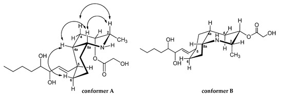 The cis-fused azadecalin ring system can exist in two chair–chair conformers [9,12]. The bicyclic ring conformation of 3 was established from NOESY experiments (Figure 1). In detail, the NOESY spectrum (Table 1 and Figure 2) of 3 contained key cross-peaks between signals for the paired 1,3-syn diaxial protons, H-2ax-H-4ax and H-4a-H-6ax. These data are in agreement with the most stable conformation of cis-decahydroquinoline core in which the C-8a-N bond is situated axially with respect to the cyclohexane chair and with the side chain attached at C-5 equatorially oriented. It should be noted that this is also the favored conformation of cis-azadecalin ring systems in other lepadins.