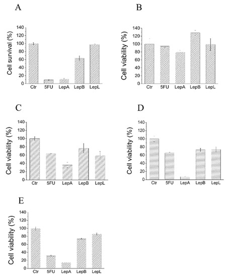 Evaluation of cytotoxic activity of lepadins 1–3 on different cancer cell lines. (A) A375; (B) MDA-MB-468; (C) HT29; (D) HCT116; and (E) C2C12 myoblasts. Cells were incubated in the presence of complete medium containing 50 µM lepadins or 100 µM 5-FU for 24 h at 37 °C. After this time, cell viability was determined using MTT assay. Each test was carried out in quadruplicate. Data showed in the figure represent mean value ± SD (n = 4). Ctr, control test carried out incubating cells in the presence of an equivalent volume of dimethyl sulfoxide, the solvent used to dissolve lepadins. 5FU, 5-Fluorouracil; LepA, lepadin A; LepB, lepadin B; and LepL, lepadin L.