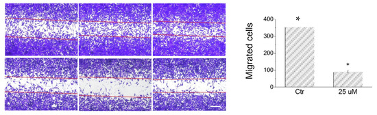 In the light of the interesting effects exerted by lepadin A on A375 cell line, we have evaluated the impact of this alkaloid on migration of A375 cells through a wound-healing assay. The wound-healing assay is a simple and inexpensive method to study directional cell migration in vitro, mimicking the cell migration during wound healing in vivo [22]. In our study, the plates containing confluent A375 cells have been scratched with a tip to generate a wound and then incubated for 16 h in the presence of complete medium supplemented or not with 25 µM of lepadin A. The images have been obtained using a contrast phase microscopy; the number of migrated cells has been determined by counting the cells moved into the wound. As shown in Figure 5, lepadin A decreases the cover rate of the scratch width and strongly inhibits cell migration.