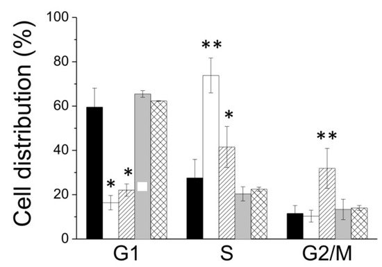 Distribution of cells into cell cycle phases express as percentage. Data showed in the figure represent the mean value ± SD. Each assay was performed in quadruplicate (n = 4). Black bars, control; white bars, A375 cells treated with 5-FU; and oblique lines, A375 cells treated with lepadin A 40 µM. * p < 0.05; ** p < 0.01.
