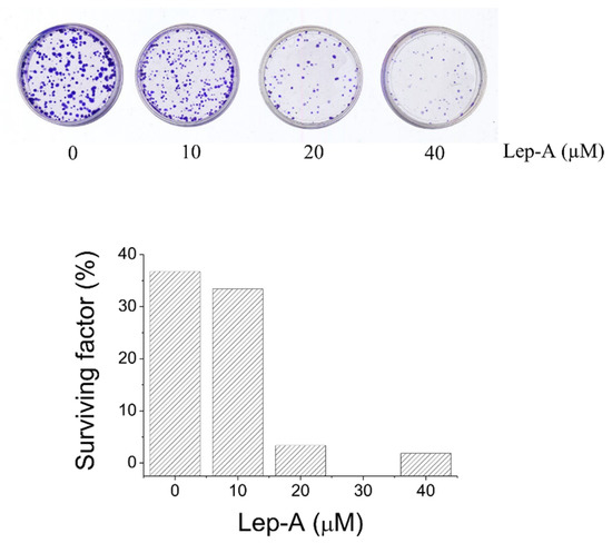 Clonogenity assay of A375 cancer cell line treated with increasing concentration of lepadin A (0, 10, 20, and 40 µM) for 24 h.