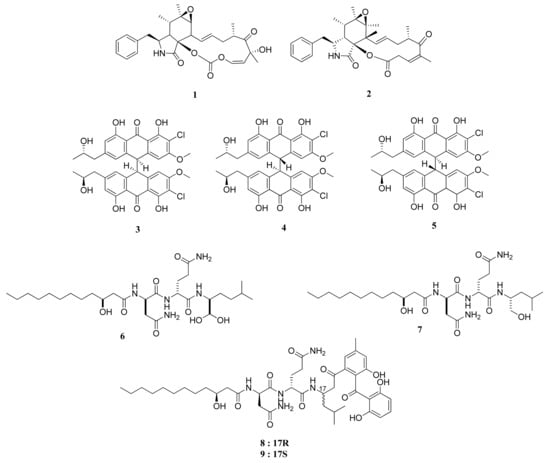 - Xiao, L.; Liu, H.; Wu, N.; Liu, M.; Wei, J.; Zhang, Y.; Lin, X. Characterization of the High Cytochalasin E and Rosellichalasin Producing-Aspergillus Sp. Nov. F1 Isolated from Marine Solar Saltern in China. World J. Microbiol. Biotechnol. 2013, 29, 11–17. [Google Scholar] [CrossRef]