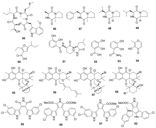 In another research, the addition of a (3-chloro-2-nitrobenzene)sulfonyl group on an indole-based scaffold compound exhibited a 100-times increment in its potency against cancer cells. This is related to its apoptotic effects, which is similar to the effects by allosteric regulation while also augmenting the stability of the agent [56]. The significant suppression of cancer cell viability is correlated with the presence of chlorine atoms on the C-6″ and shown by compounds 59 and 61 isolated from Streptomyces strain SCSIO 11791. These two compounds showed cytotoxicity against MDA-MB-231 human breast adenocarcinoma cells, NCI-H460 human non-small-cell lung cancer cells, HCT-116 colon cancer cells, HepG2 liver cancer cells, and the non-cancerous MCF10A human breast epithelial cells. Moreover, compounds 59 and 61 revealed antibacterial activity against Gram-positive bacteria including Micrococcus luteus ML01, Staphylococcus aureus ATCC 29213, and a panel of MRSA isolated from human patients (i.e., MRSA 991, MRSA 1862, MRSA 669 A, and MRSA A2) and pigs (MRSA GDQ6P012P and MRSA GDE4P037P) and against Gram-negative bacteria including Acinetobacter baumannii ATCC 19606, Vibrio coralliilyticus ATCC BAA-450, and Vibrio alginolyticus XSBZ14 [38]. A previous study by McArthur et al., demonstrated that compound 61 isolated from a marine actinomycete namely Marinispora sp. showed active against drug-resistant pathogens such as methicillin-resistant Staphylococcus aureus and Enterococcus faecium [57]. This finding may prove using SAR studies that the chlorine atom at C-6 could be pivotal for biological activities in drug design.