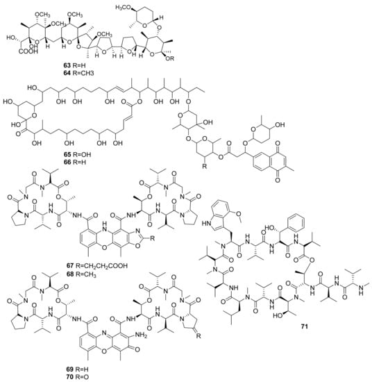 Two polyether compounds isolated from Streptomyces cacaoi 14CM034 were obtained from a sediment sample in Mersin Coastline, Turkey, at a depth of 8 m. K41 A (63) and compound 64 were tested through a WST-1 assay against Caco-2 cells and resulted in IC50 values of 7.4 and 27.9 µM, respectively (Figure 4). The activity of compound 63 is related to its structure–activity relationship, which has a highly oxygenated (O-methyl substituted) polyether framework and the presence of 4′-O-methyl-α-d-amicetose (sugar) [39].
