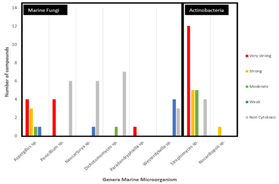 The analyzed anticancer potential compounds are clustered in eight different genera (Figure 5). Larger groupings of the potential marine fungi are observed to belong to Aspergillus sp. and Penicillium sp., albeit these two genera are shown to be promising in terms of the potency of their compounds, with an equal number (four) of metabolites with very strong potency. Particularly, compound (29) isolated from the sole Paradendryphiella sp. is considered very strong based on the rules of anticancer potency classification for CRC, as shown in Table 1. Furthermore, it showed high cytotoxic against MCF7-Sh-WISP2 compared with MCF7 or 3T3-F442A [28]. It is a epipolythiodiketopiperazine (ETP) alkaloid and has been known for its anti-fungal and antibacterial activities [52]. This compound was also isolated from marine fungi Penicillium turbatum and the Hyalodendron sp [53]. Meanwhile, secondary metabolites isolated from Streptomyces sp. show the most potent metabolites from actinobacteria.