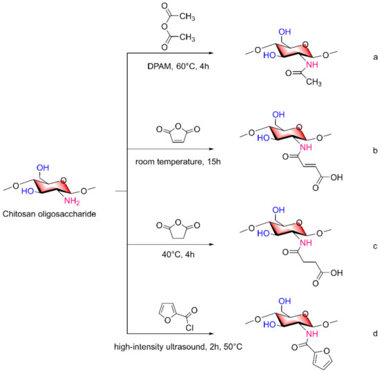 Synthesis of acylated COS derivatives. (a) 60 °C for 4 h to obtain highly acetylated COSs, (b) room temperature for 15 h to obtain N-maleoyl COS, (c) 40 °C for 4 h to obtain N-succinyl COS, (d) ultrasound, 50 °C for 2 h to obtain N-furanyl COSs.