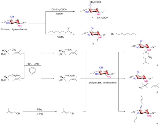Synthesis of alkylated chitosan oligosaccharide derivatives. (a) carboxymethyl COSs, (b) octane COSs, (c) alkylated COS derivatives Lin-g-COS, (d) alkylated COS derivatives Cit-g-COS, (e) COS-O-Ter derivatives.