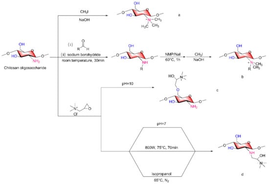 Synthesis of quaternized chitosan oligosaccharide derivatives. (a) N, N, N-quaternized COSs, (b) more diversified N-quaternized COSs, (c) pH = 10, glycidyl trimethylammonium chloride can introduce quaternary ammonium groups in 6-OH of COSs, (d) pH = 7 or other conditions, glycidyl trimethylammonium chloride can introduce quaternary ammonium groups in -NH2 of COSs.