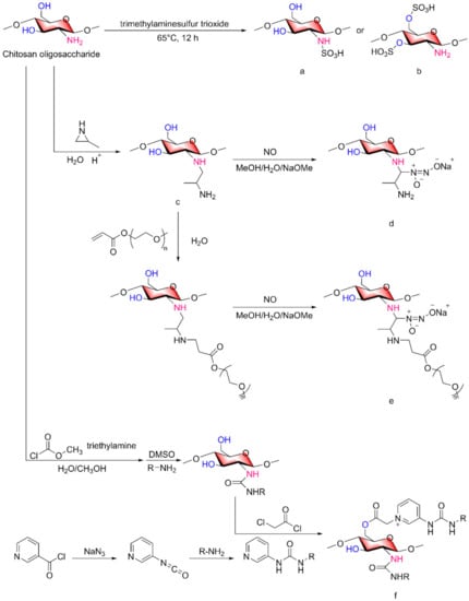 Synthesis of other varieties of chitosan oligosaccharide derivatives. (a) N-sulfated COSs, (b) 3-O-sulfated COSs, (c) grafting of 2-methyl aziridine onto primary amines of COSs, (d) N-diazeniumdiolate formation of COSs, (e) PEGylation of 2-methyl aziridine-grafted-COS with NO donor functionalization, (f) 2,6-diurea-COS derivative.