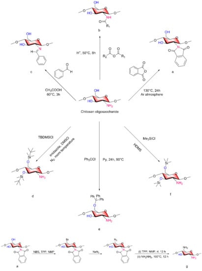 Synthesis of common protective groups of COSs. (a) the amino groups of COSs were protected by phthalic anhydride to form an imide structure, (b) N-acylated COSs, (c) N-benzylidene of COSs, (d) 3,6-O-di-tertiarybutyldimethyls-COSs, (e) 6-O-triphenylmethyl COSs, (f) 3,6-O-di-trimethylsily COSs, (g) 2,6-diamino-chitosan.