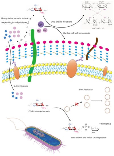 The following mode of action of chitosan or COSs as antibacterial agent have been proposed. First, it is generally believed that the protonated amino groups on COSs bind to negatively charged groups on the surface of microorganisms, which is the key mode of action of their antibacterial activity [53]. COSs with positive amino charges will move to the surface of negatively charged bacteria due to electrostatic action, resulting in the hydrolysis of peptidoglycan indicated by gram-positive bacteria and the leakage of the intracellular contents. The second proposed mode of action, involving the outer membrane permeability of gram-negative bacteria, suggests that COSs can influence the transport of nutrients to cells by gram-negative bacteria in the form of ionic bonds. In the third mechanism, COSs cross cell membranes and cytoplasm and interact with bacterial DNA, preventing it from being transcribed. Finally, a proposed mode of action is that where metal ions present in the bacterial surface are chelated by the amino groups of chitosan. This chelation effect is found to overpower the electrostatic effect when the pH of the medium is higher than the pKa of chitosan [63]. When bacteria undergo amino chelation, the stability of bacterial cell walls is destroyed, exhibiting antibacterial effects. Figure 7 shows the mechanism of COSs against gram-positive bacteria.