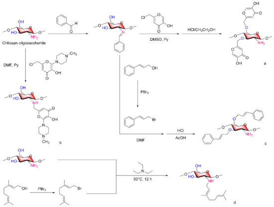 To date, a large number of structural modifications of COSs have been reported, and the structure of COSs can be artificially modified by means of chemical synthesis to further increase their biological activity. The modification sites of COSs concentrate on the two types of active groups, hydroxyl groups and amino groups. Generally, acetylation, alkylation, quaternization, or reaction with aldehydes and ketones occur on the amino group, while the hydroxyl group can undergo reactions such as acetylation, cross-linking, graft and so on. Xiaoli Liu et al. [24,25] synthesized a COS-N-chlorokojic acid mannich base (COS-N-MB) polymer based on COSs that had better antioxidant and antibacterial properties than free COSs and kojic acid. Lin Yue et al. [26] synthesized three kinds of COS-O-cinnamyl alcohol (Cin) compounds with different degrees of substitution (DSs) using Cin, and they exhibited higher thermal stability, better antimicrobial activity and lower crystallinity than COSs.