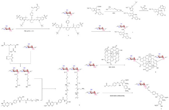 Jingjing Zhang et al. [51] prepared 2-urea-COS derivatives and 2,6-diurea-COS derivatives (Figure 5f) by 2-methoxyformylated of COSs. By changing the material represented by the R group, eight of the above substances were obtained.