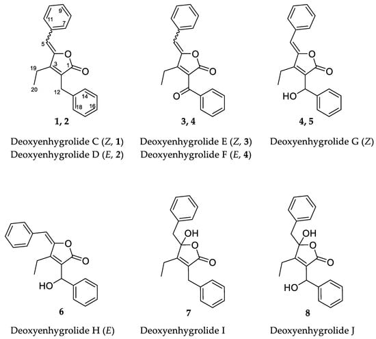 Chemical structures and carbon numbering of deoxyenhygrolides C–J (1–8).