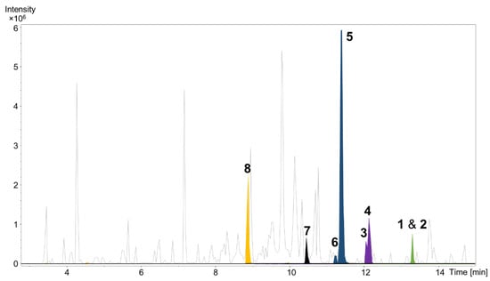 High performance liquid chromatography–mass spectrometry base peak chromatogram (HPLC–MS BPC) (grey) and extracted ion chromatograms (EICs) of 1 and 2 ([M + H]+ 291.1378 m/z, green), 3 and 4 ([M + H]+ 305.1174 m/z, purple), 5 and 6 ([M + H]+ 307.1331 m/z, blue), 7 ([M + H]+ 309.1487 m/z, black) and 8 ([M + H]+ 325.1436 m/z, orange) from Plesiocystis pacifica DSM 14875T ethyl acetate extract.