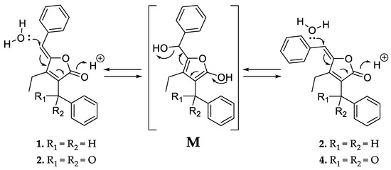 Proposed equilibrium of the tautomer pairs 1/2 and 3/4, which includes a transient quinone methide-like intermediate (M).