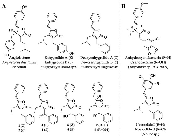 Due to the diminutive production and availability of 1, 2, 3, 4, 6 and 7, only the major compounds 5 and 8 were investigated for antimicrobial activity. Compound 5 exhibited weak antibacterial and antifungal activity against TolC-deficient Escherichia coli and Mucor hiemalis with minimal inhibitory concentrations (MIC) of 64 µg/mL. On the other hand, 5 showed no inhibitory activity against E. coli DSM 1116T, Bacillus subtilis DSM 10T, Micrococcus luteus DSM 1790 and Wickerhamomyces anomalus DSM 6766. The lack of any observed relevant microbial inhibitory activity in 5 or 8 was not completely unexpected, since deoxyenhygrolide A and B from “Enhygromyxa niigataensis” SNB-1 also exhibited no antimicrobial activity [17], in contrast to enhygrolide A (MIC value of 4 µg/mL against Arthrobacter cristallopoietes), which features a phenol group (Figure 5) [16]. Other natural products containing a butenolide core have been shown to exhibit biological activities, such as the cytotoxic nostoclides (IC50 = 10 µg/mL, neuro-2a CCL 131 and KB CCL17) [20] or the antibacterial cyanobacterin [21].