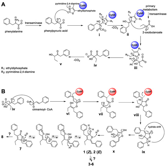 Putative biosynthetic formation of the deoxyenhygrolides C–J (1–8). (A) Formation of the acyloin intermediate iv by the thiamine pyrophosphate-(TPP)-dependent enzyme CybE homolog starting from the substrates phenylpyruvic acid and 2-oxobutanoate. (B) Proposed furanolide formation leading to 1–8 catalyzed by the identified CybF homolog from P. pacifica DSM 14875T. The proposed furanolide formation uses iv and cinnamoyl-CoA as substrate and performs a reaction cascade, which includes an acylation, C,C-bond formation and a hydride shift reaction. The proposed biosynthetic formation of 1–8 was adapted from Agostino et al. [24], which describes the underlying furanolide formation mechanism in the structurally related natural product cyanobacterin.