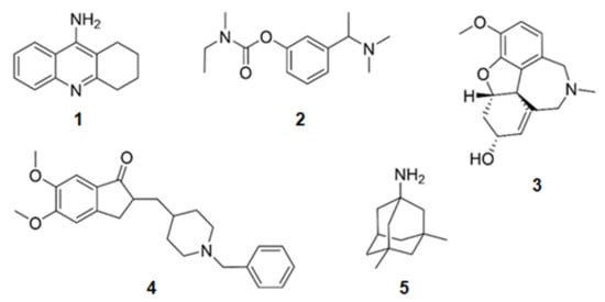 Some compounds containing nitrogen in their structures have already been approved for the treatment of AD (Figure 1). Tacrine (1) (withdrawn from the market in 2012 due to adverse effects), donepezil (2), rivastigmine (3), and galantamine (4) were approved due to their activity on the inhibition of AChE. Menantine (5) is the other compound approved as a N-methyl-d-aspartate receptor antagonist. All of them are obtained synthetically. Although originally galantamine (4) was isolated from the terrestrial plant Galanthus nivalis, now it is produced by several synthetic routes.