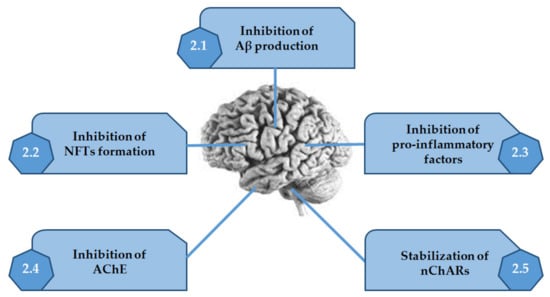 On the other hand, ACh binds to several receptors in the synaptic cleft. One of them, nicotinic ACh receptors (nAChRs) in the central nervous system, control the liberation of other neurotransmitters and are involved in cognitive processes and memory [,]. Thus, another strategy to combat AD is controlling nAChRs.