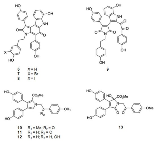 From the same marine sponge, Ianthella sp., other series of compounds were isolated, the lamellarins and the ianthellidones [,] (Figure 3). The lamellarins, pyrrole-containing alkaloids, were reported as lamellarins O (10), O1 (11), and O2 (12). As ianthellidons, pyrrolidone containing molecules, was only reported ianthellidone F (13). The biosynthesis of lamellarins is seen as a condensation between tyrosine and one or more substituted 4-hydroxyphenyl residues. The ianthellidones are viewed as oxygen addition adducts of lamellarins. The lamellarins and ianthellidone F (13) showed reduction of β-secretase activity, being lamellarin O1 (6) the most potent.