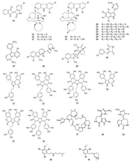 6-Bromoindirubin (14) (Figure 4) was found from the Mediterranean mollusca Hexaplex trunculus and reported as a selective inhibitor of GSK3β []. It is a bis-indole alkaloid.