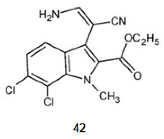 KH-CB 19, dichloroindolylenaminonitrile (42), a derivative of tryptophan is a potent inhibitor not only for DyrklA, as already mentioned, but also for CLKl [].