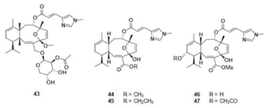 Eleutherobin (43) [,] (Figure 6), a derivative of l-histidine, was extracted from the coral Eleutherobia sp. Sarcodyctins A (44), B (45), C (46), and D (47) (Figure 6) were extracted from the coral Sarcodictyon roseum [,]. They are alkaloids with the same scaffold and promote MT-stabilization [,] by interaction with β-tubulin at the taxane binding site [].